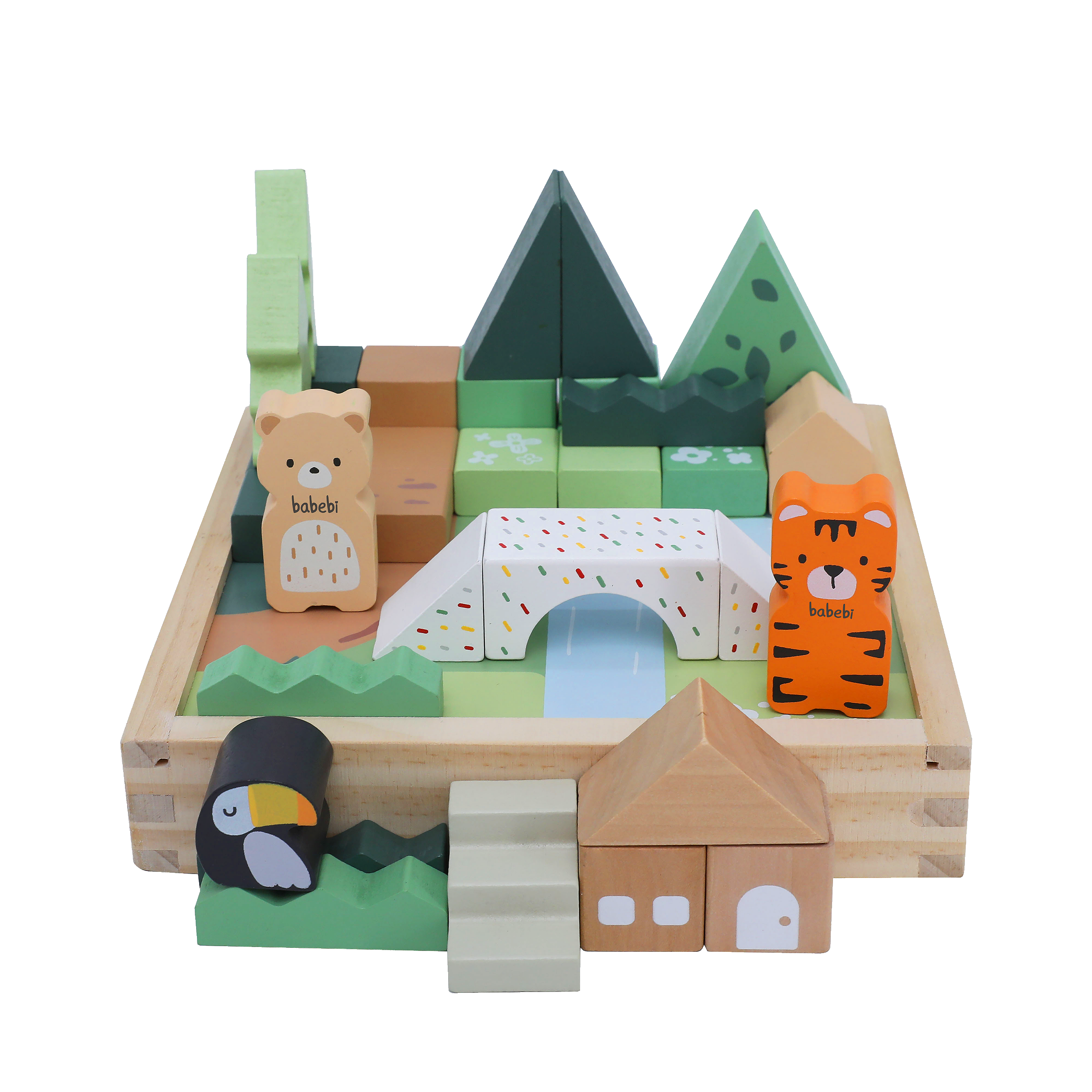 - Conteúdo da Embalagem: 1 conjunto de blocos variados de madeira (incluindo cubos, pontes e cilindros), peças de cenário (árvores e arbustos) e personagens da floresta (Ursinho e amigos).