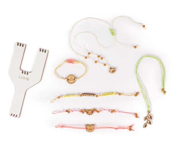 Componentes da embalagem: 6 pingentes exclusivos, 6 tipos de fios e cordões, miçangas de madeira,1 ferramenta para macramê e 1 manual de instruções.