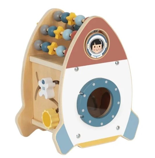 Com cores suaves e detalhes delicados, o brinquedo oferece múltiplas brincadeiras: circuito de contas espaciais, engrenagens giratórias, janelinha interativa com astronauta, hélice que se movimenta e muito mais. Cada lado apresenta um novo desafio que incentiva a curiosidade, a coordenação motora fina, a percepção visual e o pensamento exploratório.
