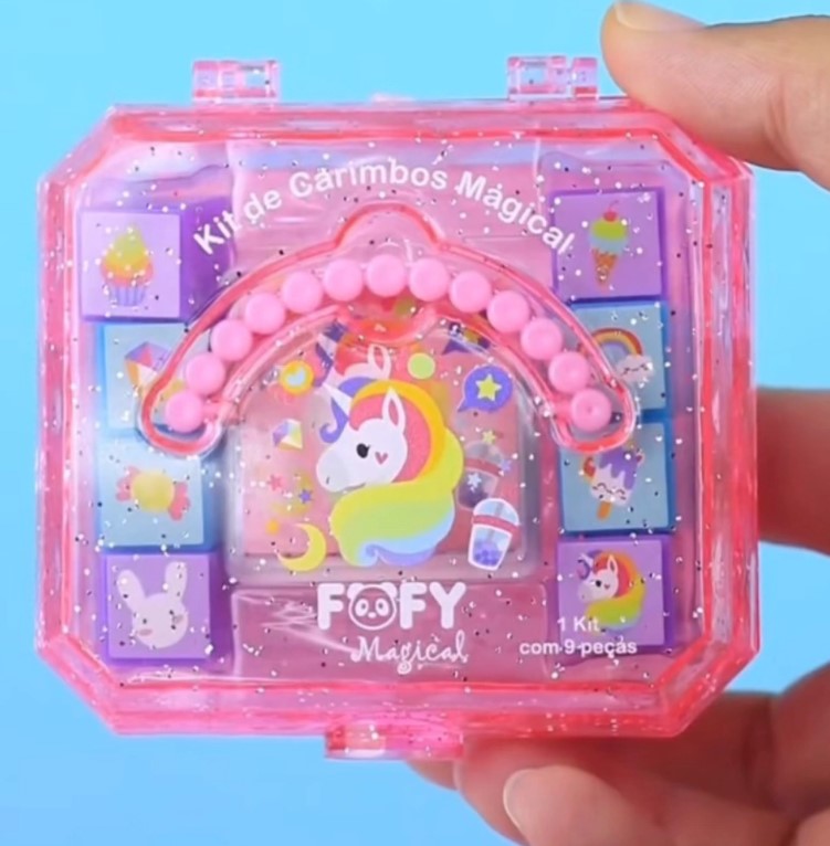 O kit contém uma maleta plástica, 8 carimbos e almofada com 4 cores.