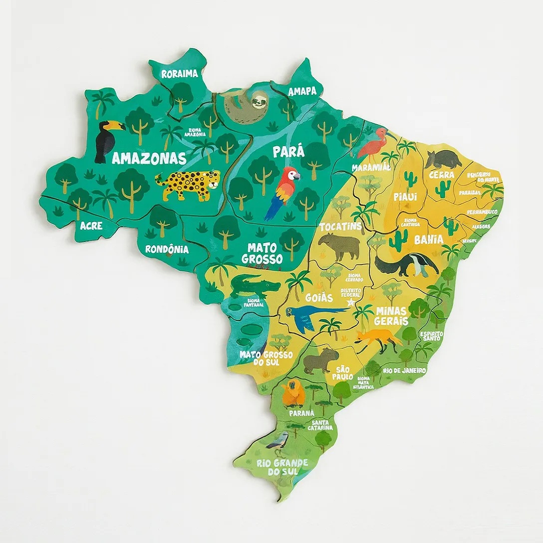 O Novo Quebra-Cabeça Mapa do Brasil Newart é um brinquedo educativo de madeira que convida as crianças a explorarem o nosso país de forma divertida e interativa. Cada peça representa um estado, permitindo montar o mapa completo enquanto aprende sobre as regiões do Brasil. O Quebra-cabeça é maravilhosamente ilustrado com a fauna e flora de cada região do nosso pais, e cada peça tem atrás a região em que o estado pertence, sua sigla e sua capital!