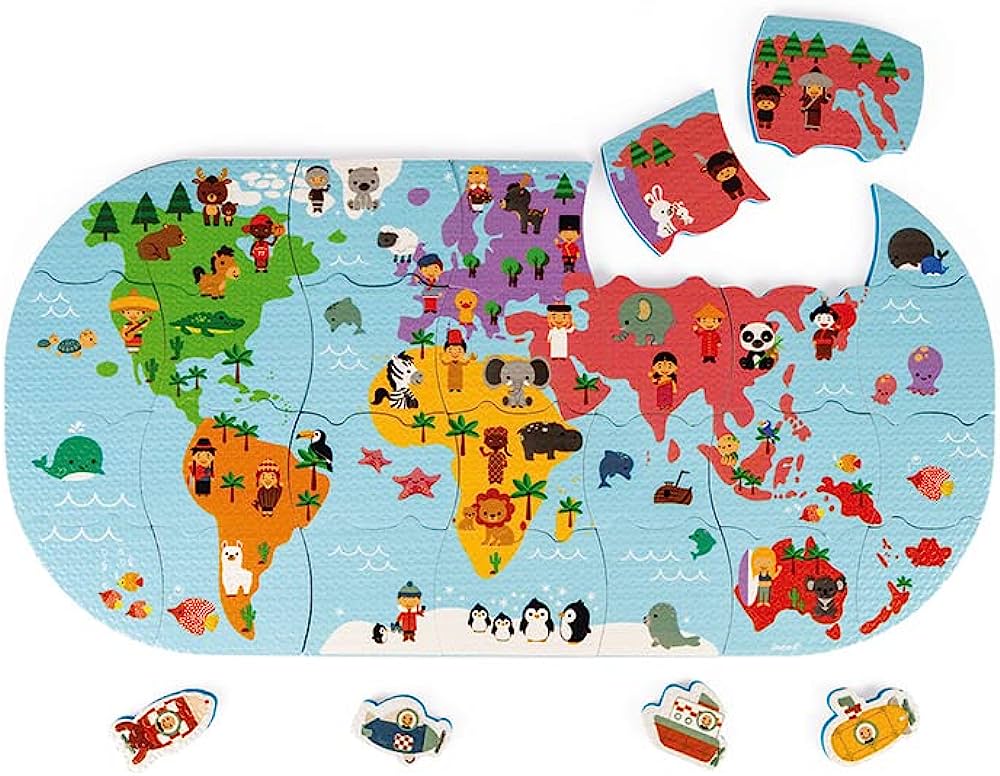 Transforme a hora do banho em uma verdadeira aventura pelo mundo com o Mapa dos Exploradores do Banheiro, da Janod! Com 28 peças de quebra-cabeça e 4 veículos de espuma, a criança explora os continentes de forma lúdica, viajando pelo ar e pelo fundo do mar enquanto brinca.