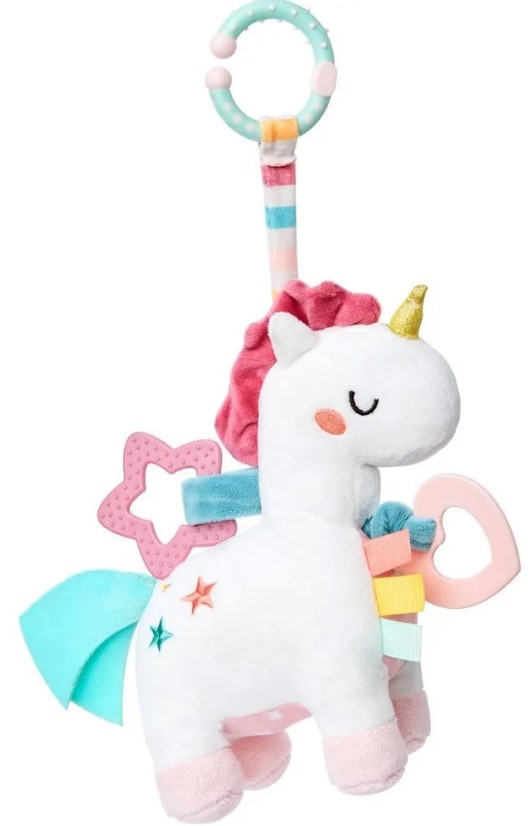Possui mordedores com diferentes texturas, elementos com sons de chocalho e uma suave melodia ativada por uma cordinha, que acalma e entretem o bebê.