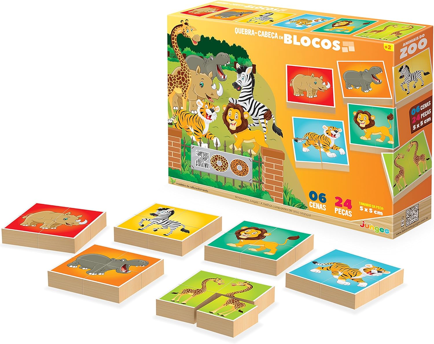 Quebra-cabeça em Blocos da Junges em madeira de reflorestamento (MDF) e com tinta atóxica, as peças são impressas direto na madeira e possuem espessura maior para facilitar a montagem. Jogo com 24 peças que formam 6 cenas com 4 peças cada.